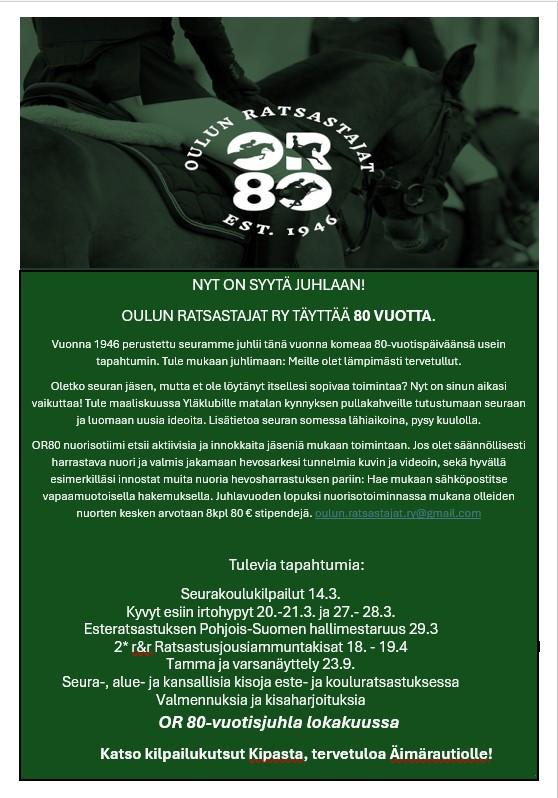 Oulun Ratsastajat Ry on Pohjois-Suomen suurin ja pisimpään toiminut ratsastuseura, joka on tarjonnut jäsenilleen aktiivista toimintaa jo vuodesta 1946. Seuran toiminta keskittyy Äimäraution hevosurheilukeskukseen, josta löytyvät seuran ratsastusalueet sekä kerhotilat. Tervetuloa tutustumaan!